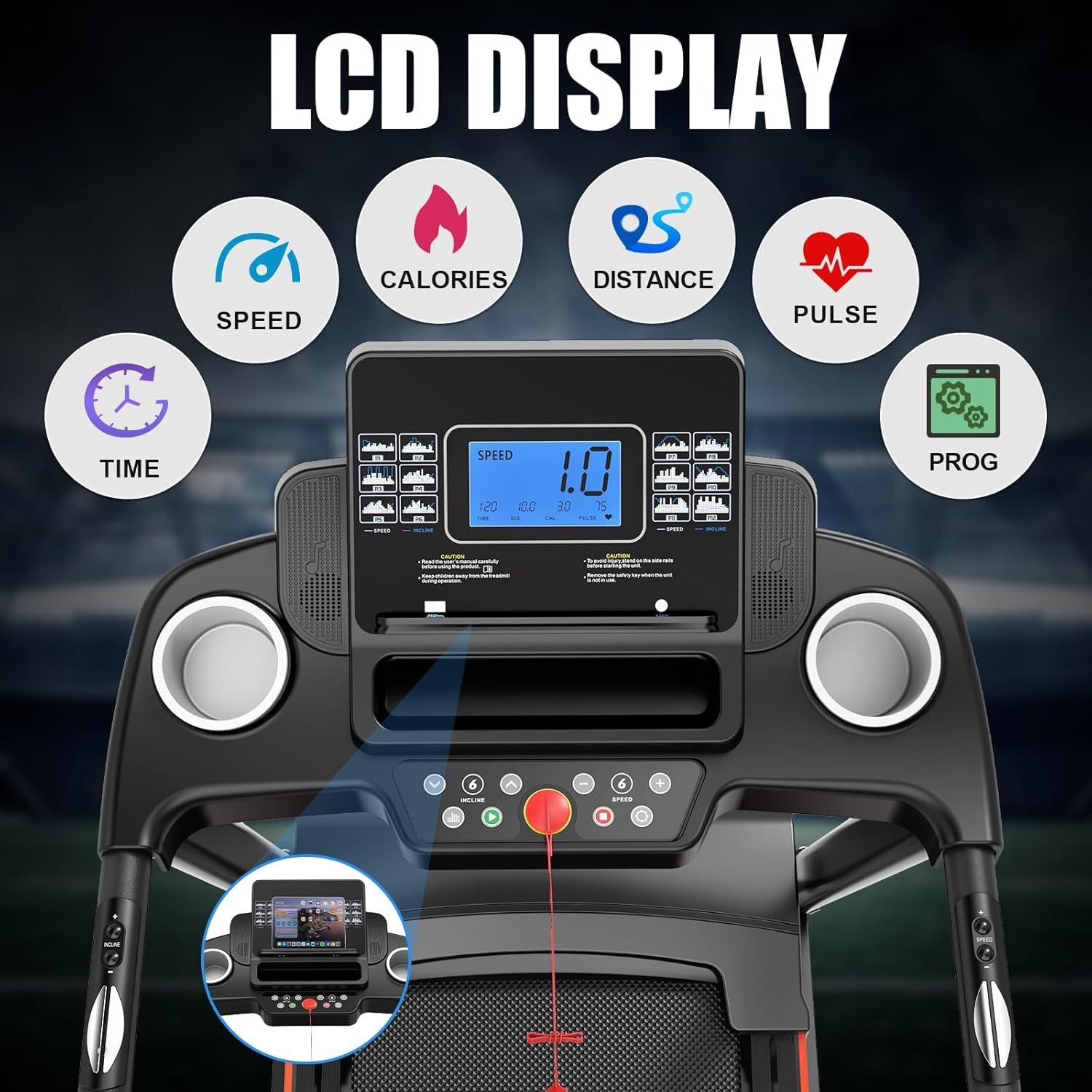 【Smart Console】The smart treadmill is equipped with a multi-function console for controlling start/stop, speed and built-in Bluetooth audio volume. It provides 12 preset scientific running programs to meet various needs. The large LED screen displays real-time workout data including time, distance, calories, speed and heart rate. It can store water bottles, mobile phones, tablets and other items, ensuring you have a comprehensive exercise experience.